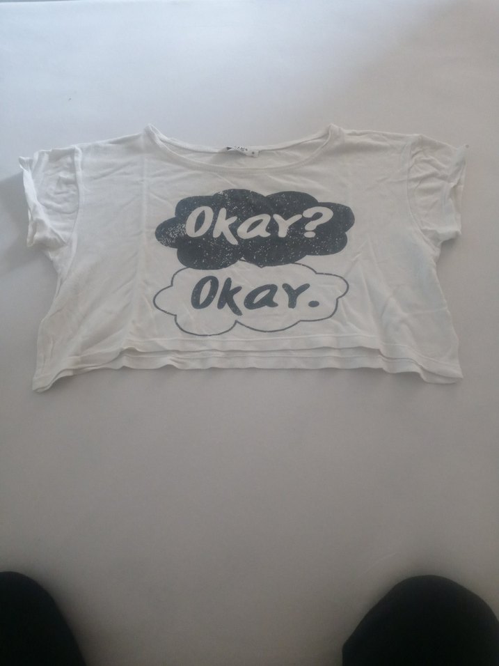 Beyaz, kısa kollu, bol kesim kız çocuk tişörtü. Gri renkli "Okay? Okay." baskılı, sokak tarzında. Kağıt gibi dokuda.