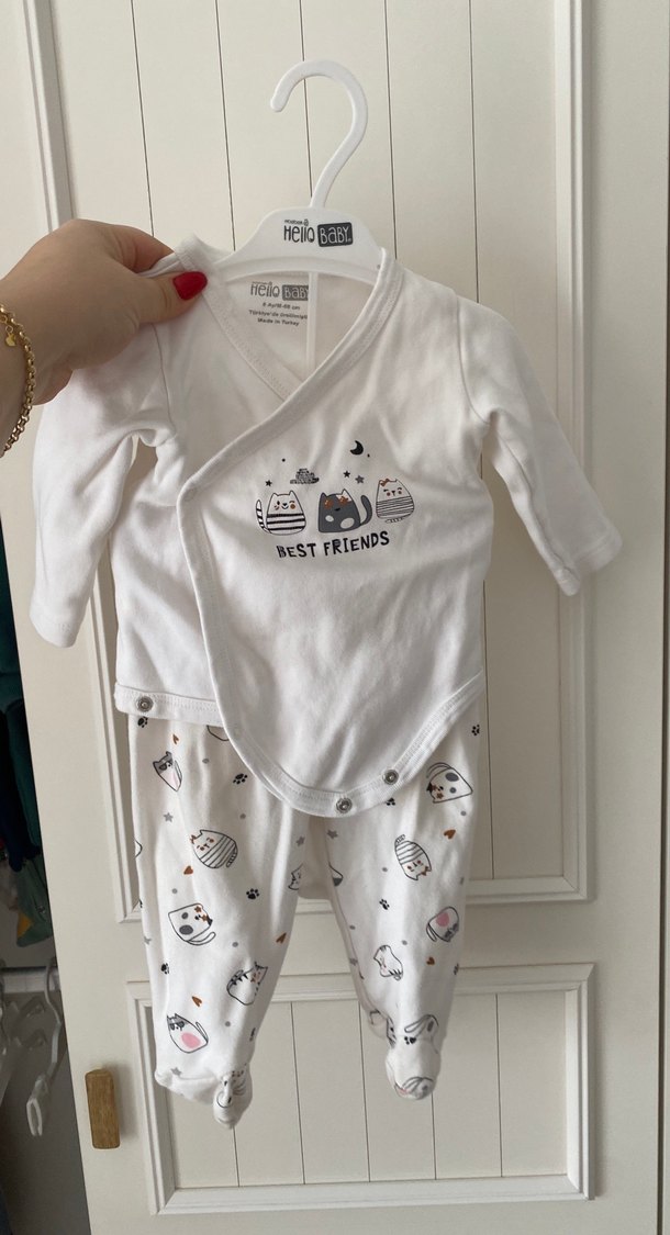 Yumuşak pamuklu beyaz kız erkek bebek takımı, uzun kollu ve yüksek yakalıdır. "BEST FRIENDS" yazılı baskı ve gri desenler içerir.