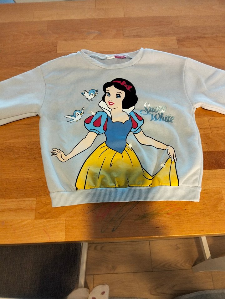 Pamuklu beyaz sweatshirt, uzun kollu ve yuvarlak yaka. Renkli Pamuk Prenses baskısı ve bol kesim ile rahat bir stil sunar.