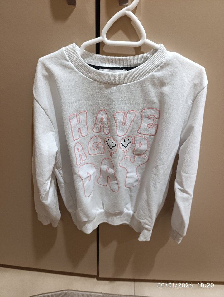 Beyaz renkli, uzun kollu ve bisiklet yaka sweatshirt. Örgü dokusu ve pastel tonlarda "Have a Good Day" baskısı bulunur. Rahat kesim, günlük sokak stili için uygun.