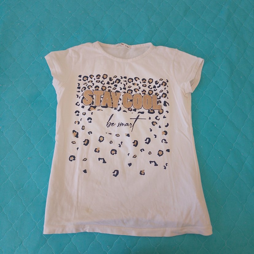 Pamuklu beyaz kız tişörtü, kısa kollu ve bol kesimdir. Leopar desenli baskısı ve "STAY COOL be smart" yazısı ile rahat ve şık bir tarz sunar.