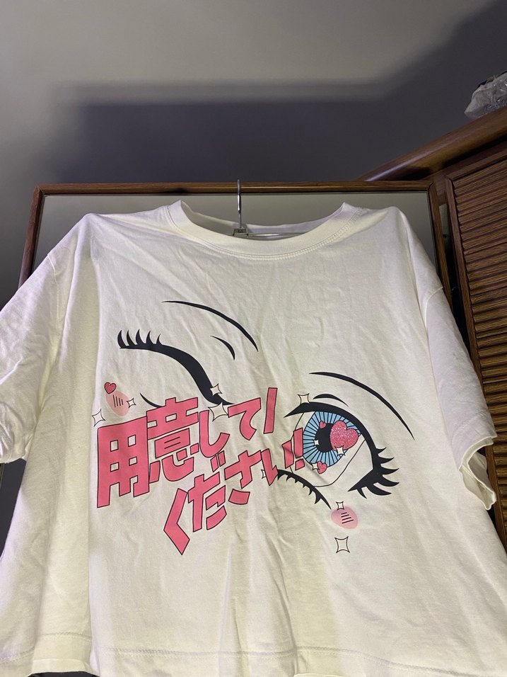 Pamuklu beyaz, kısa kollu, bol kesim kız tişörtü, önünde pastel tonlarda baskılı desen bulunur. Sokak stili için uygun.