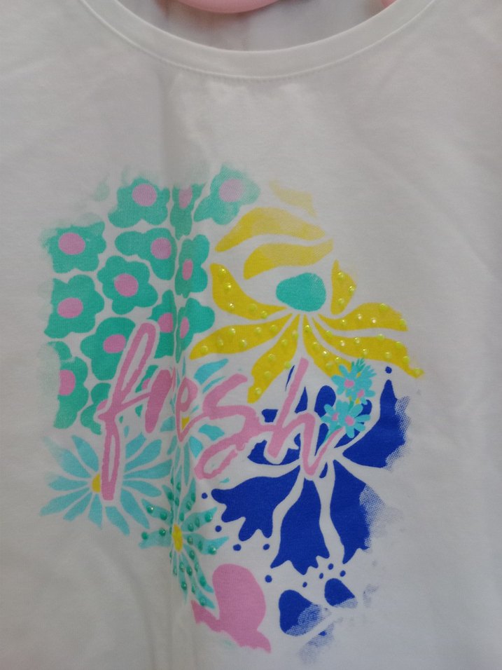 Beyaz renkli, pamuk kumaştan yapılmış, kısa kollu ve yuvarlak yakalı kız tişörtü. Önünde renkli baskılı bohem desen bulunur.