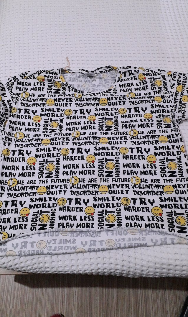 Beyaz renkli, kısa kollu, salaş kesim kız tişörtü. Üzerinde motivasyonel yazılar ve gülen yüz baskıları bulunur. Rahat ve günlük kullanıma uygun tekstil kumaş.belli belirsiz küçük leke var foto cektim