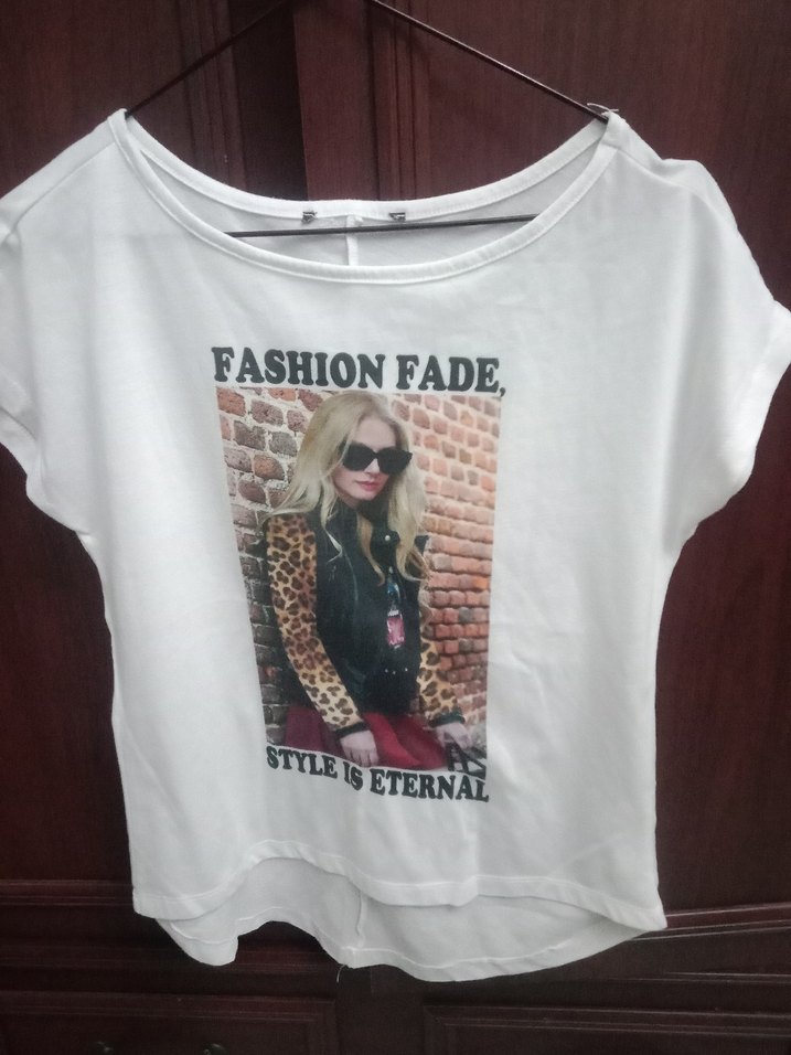 Beyaz, salaş kesim kız tişörtü, kısa kollu ve bisiklet yaka. Parlak sentetik kumaş üzerine baskılı grafik detayı bulunur.