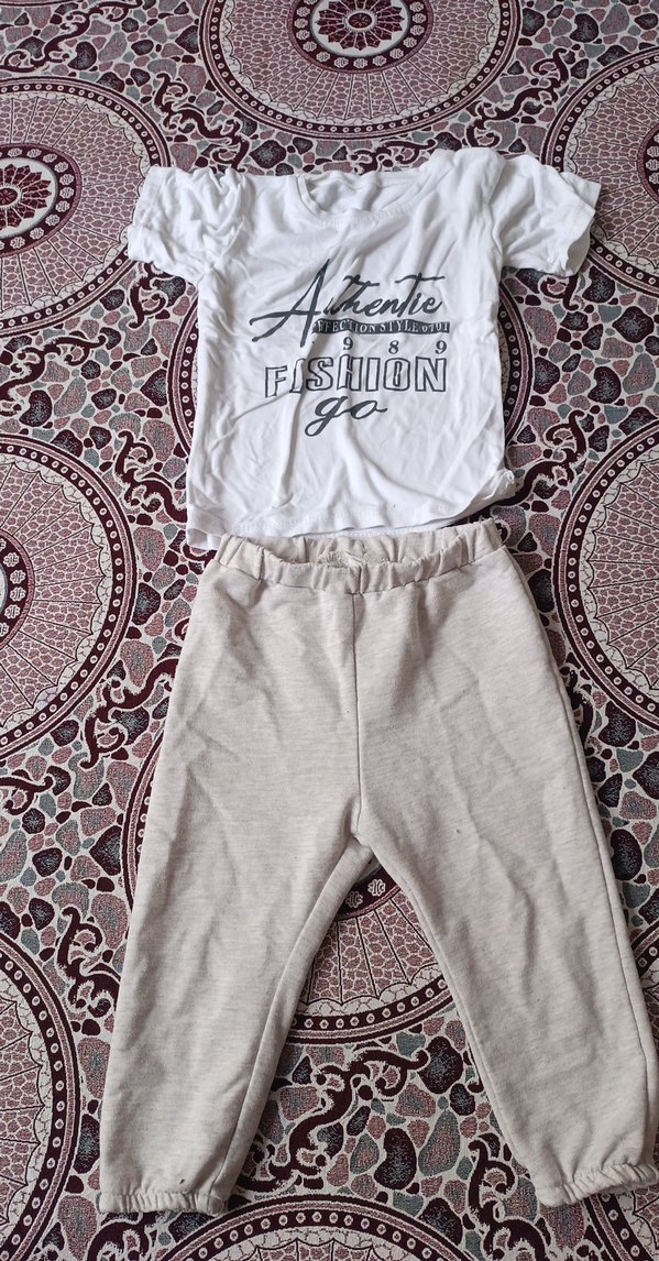 Beyaz baskılı kısa kollu pamuklu tişört ve gri bol kesim eşofman altından oluşan rahat ve şık set. Sokak stiline uygun trendy görünüm sağlar.