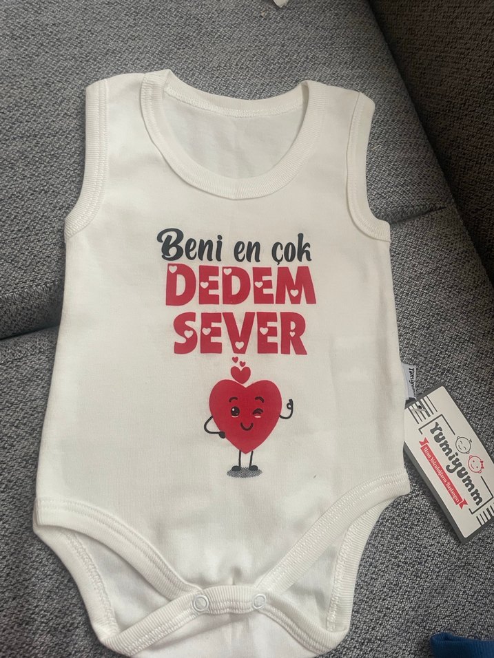 Beyaz, kolsuz, yuvarlak yakalı bebek body, üzerinde kırmızı kalp ve 'Beni en çok DEDEM SEVER' yazılı baskı bulu