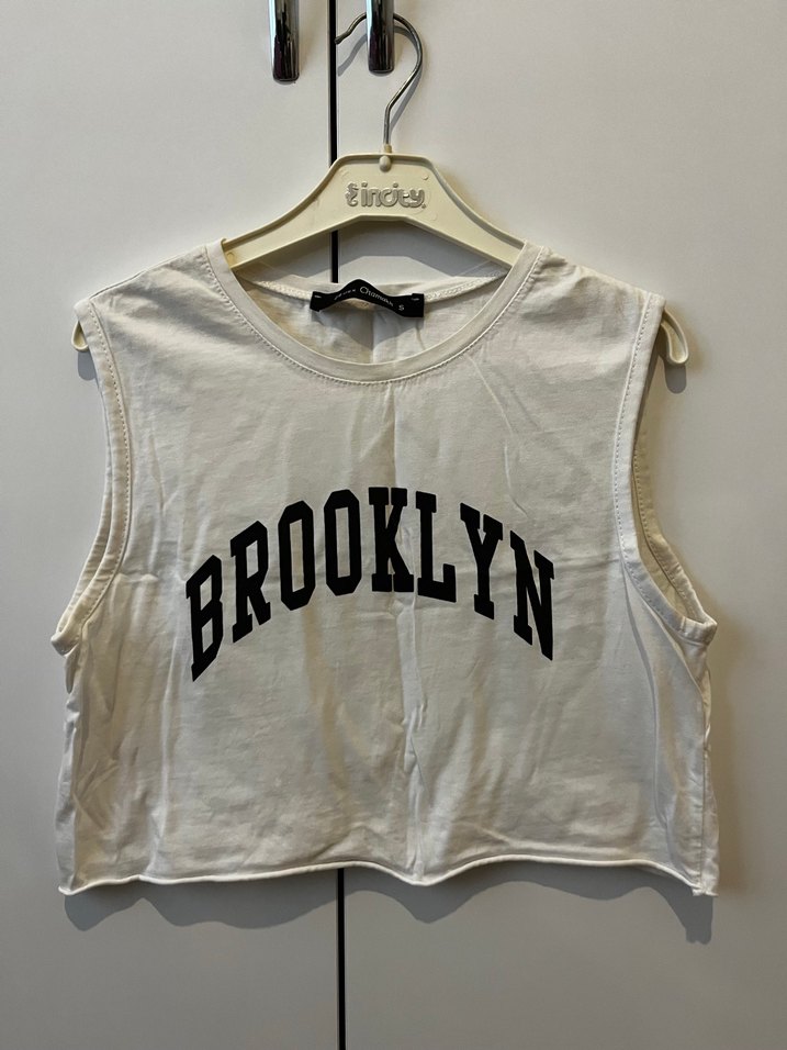 Beyaz pamuklu kolsuz crop top, bol kesim ve önünde 'BROOKLYN' baskısı bulunur. Kısa boylu, bisiklet yaka ve kemerli detaylıdır.