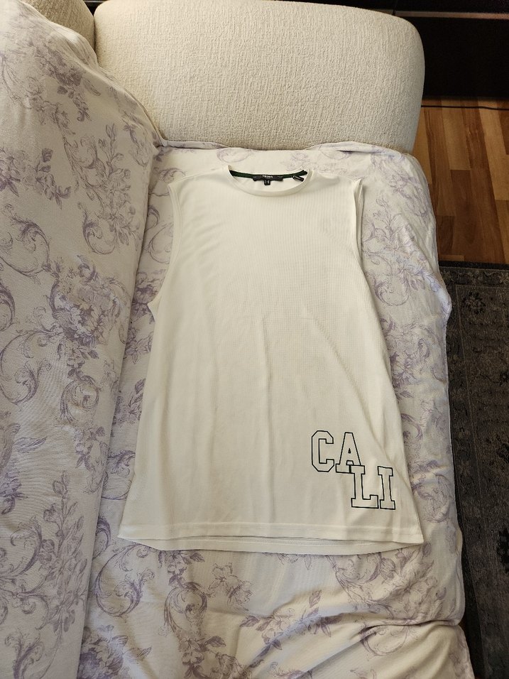 Yumuşak pamuk kumaştan yapılmış, kolsuz, beyaz renkli erkek üst. Salaş kesim ve yuvarlak yaka ile, gri 'CALI' baskılı, drapeli tasarıma sahip. 36 bedendir.