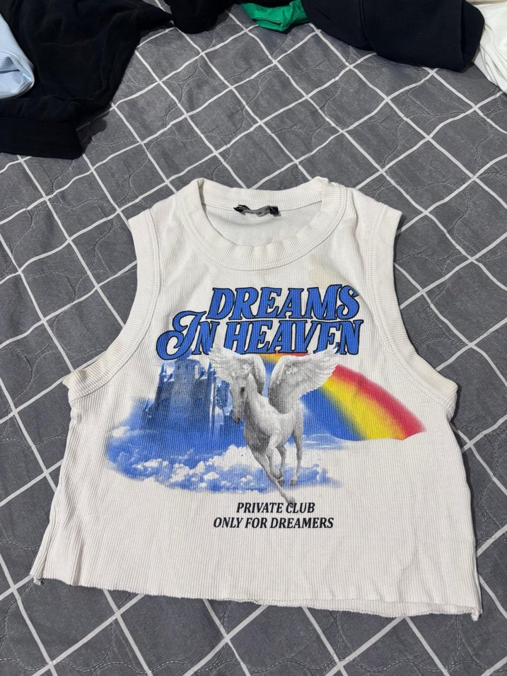 Pamuk kumaştan yapılmış, kolsuz ve straplez kesime sahip beyaz baskılı kız tişörtü. Kanatlı at ve gökkuşağı desenleri ile rock punk tarzını yansıtır.