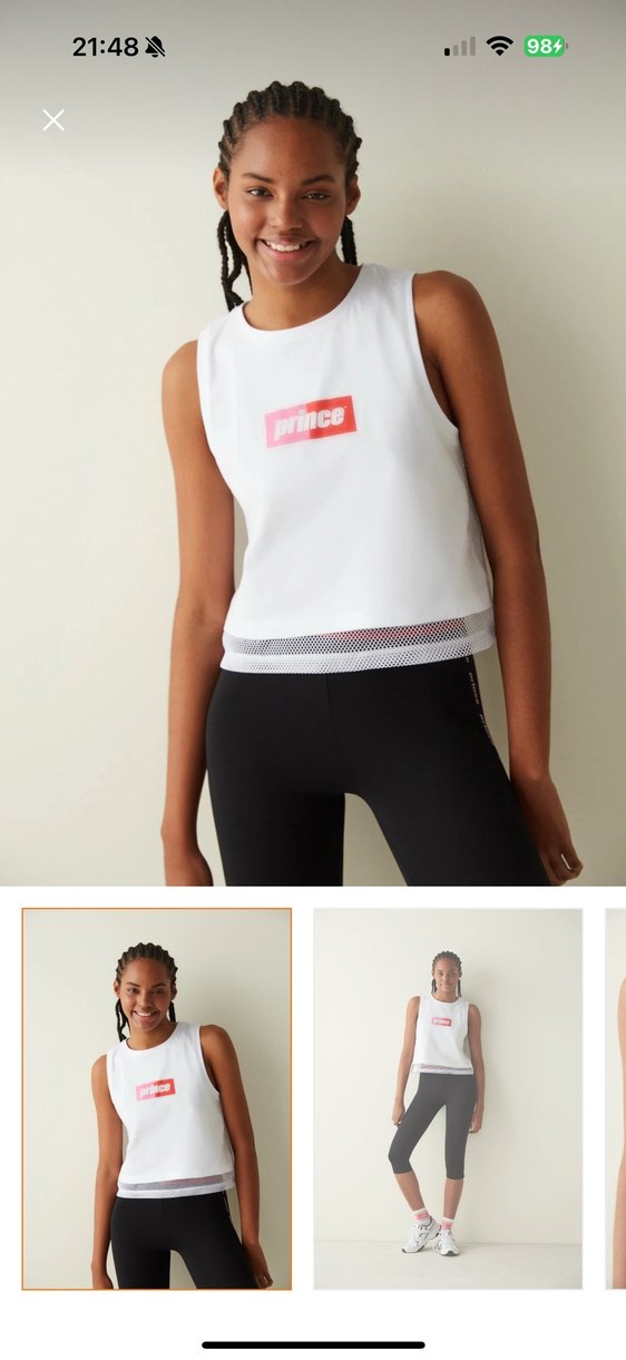 Baskılı logo ve file detaylı, kolsuz beyaz, dar kesim mini spor üst. Pürüzsüz sentetik kumaştan, spor ve günlük kullanıma uygun. ♀️