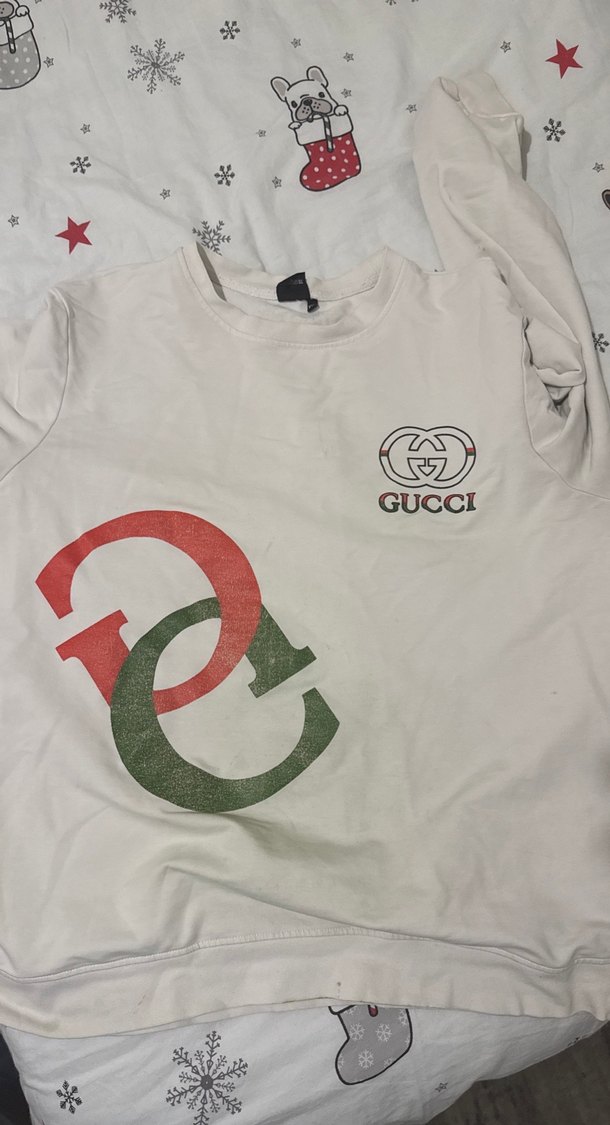 Yumuşak pamuktan, baskılı Gucci logolu, uzun kollu, yuvarlak yakalı ve bol kesim beyaz maternity tişört. Günlük rahat kullanım için uygundur.