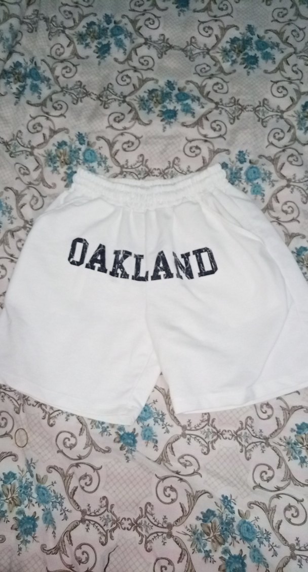 Beyaz pamuklu, bol kesim, gri baskılı 'OAKLAND' yazılı hamile mini şort. Kısa boy, günlük rahat sokak stili.