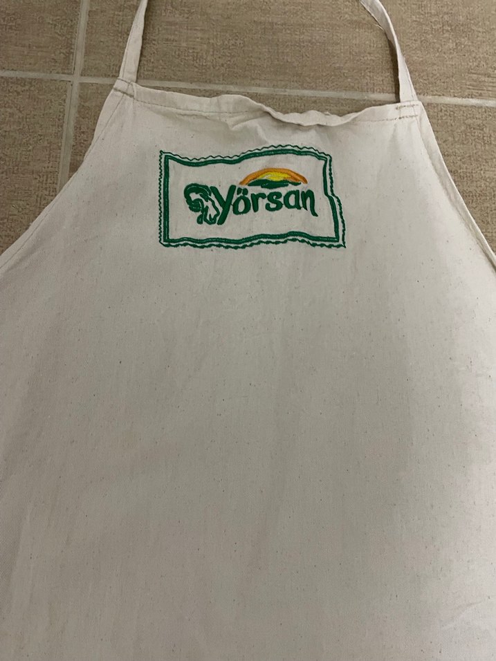 Beyaz renkli, önünde Cyorsan baskısı bulunan mutfak önlüğü. Yumuşak ve dayanıklı kumaştan, parlak görünümlü, ayarlanabilir boyun askılı.
