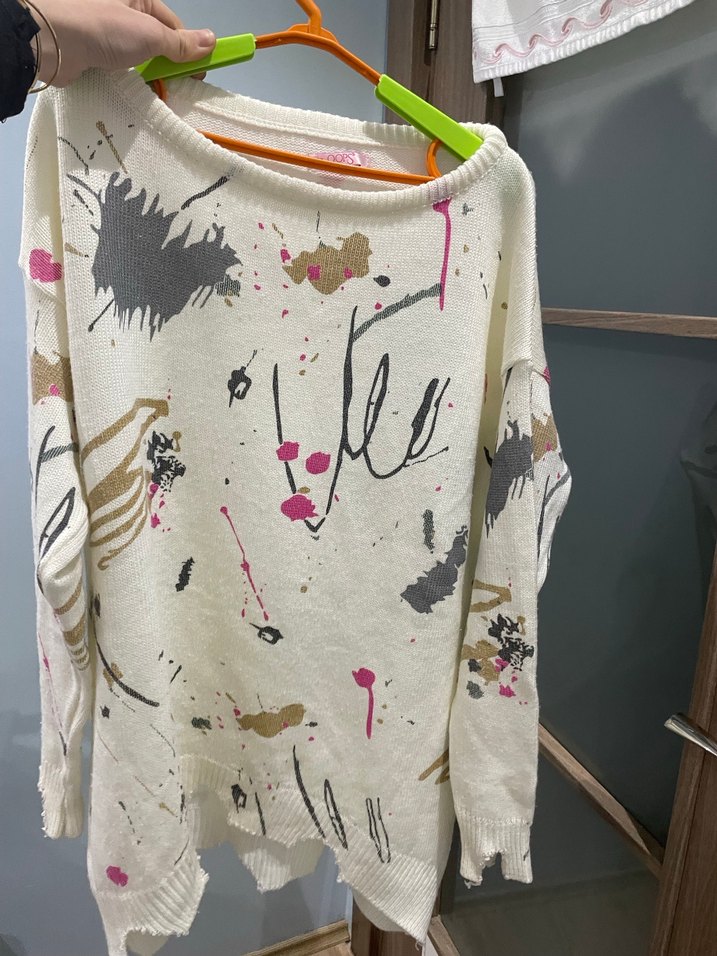Beyaz renkli, uzun kollu ve yuvarlak yakalı, gevşek kesim örgü triko. Kısa boy ve soyut baskılı desene sahip, günlük sokak stiline uygun.