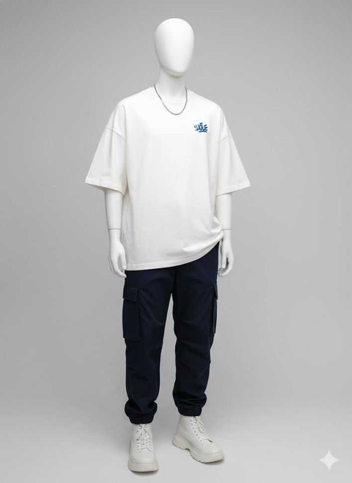 Pamuk kumaştan üretilen beyaz erkek tişört, kısa kollu ve bisiklet yaka tasarıma sahiptir. Baskılı deseni ve oversize kesimiyle günlük rahat sokak stiline uygundur.