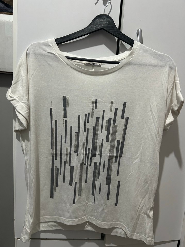 Bu beyaz pamuk tişört, oversize kesim, kısa kollu ve yuvarlak yaka detaylarına sahip olup modern baskılı deseniyle günlük sokak stiline uyum sağlar.