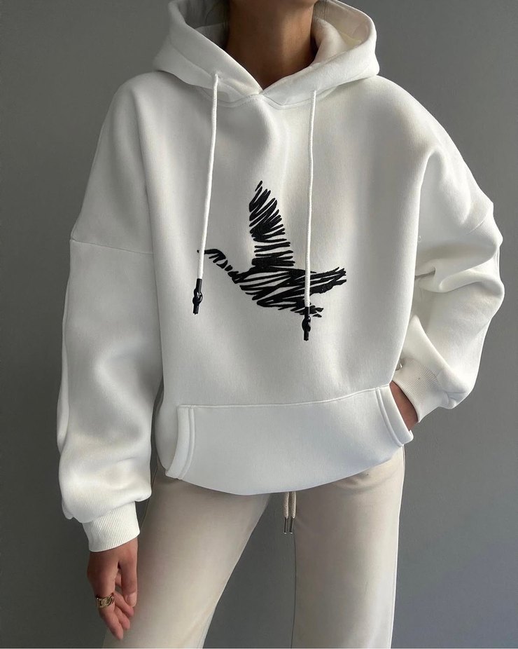 Uzun kollu, yuvarlak yaka, siyah kuş baskılı beyaz oversize sweatshirt. Yumuşak ve sıcak kumaştan, rahat kullanım için ideal. ️