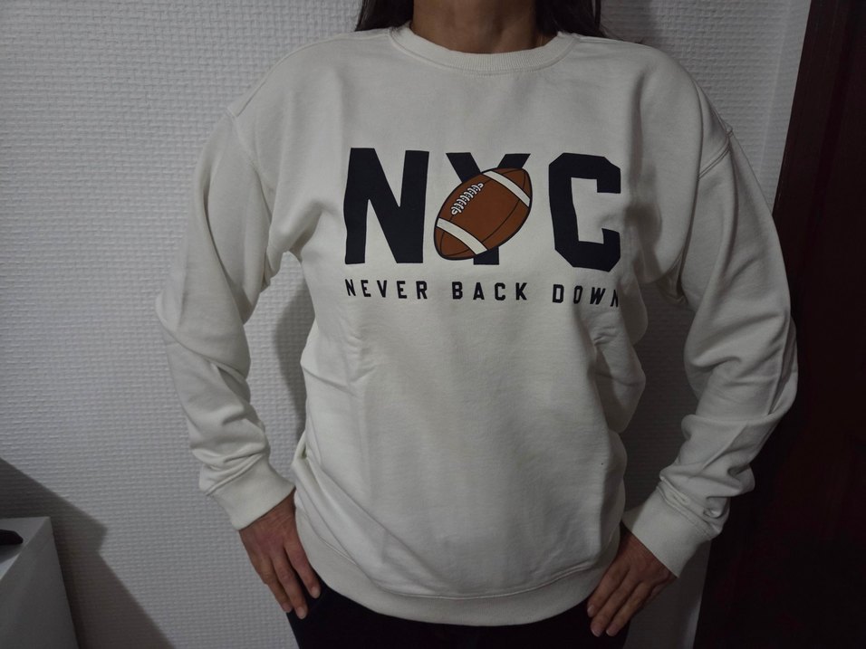Beyaz renkli, yuvarlak yakalı ve uzun kollu bu sweatshirt, bol kesim ve normal boydadır. Üzerinde futbol topu ve 'NEVER BACK DOWN' yazılı baskı bulunur. Yumuşak ve sıcak kumaştan yapılmıştır. mango kids kardeşim hızlı büyüdü bir kaç kez giymiştir 13 14 yaş
