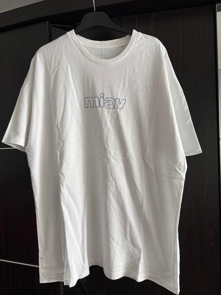 Beyaz, pamuk kumaştan, oversize kesim mavi tişörtü. Kısa kollu ve yuvarlak yaka, göğüste "miav" baskılı sade tasarım.