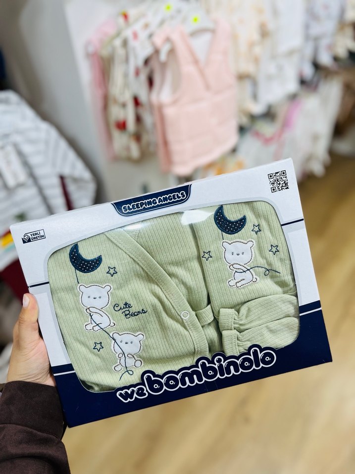 Beyaz pamuklu bebek uyku seti, hafif renklere ve sevimli ayıcık baskılara sahiptir. Yumuşak ve rahat kumaştan üretilmiştir. Kutuda 'webambinolo' markası yer alır. Yeni sıfır ürün 5 li yenidoğan hastane çıkışı