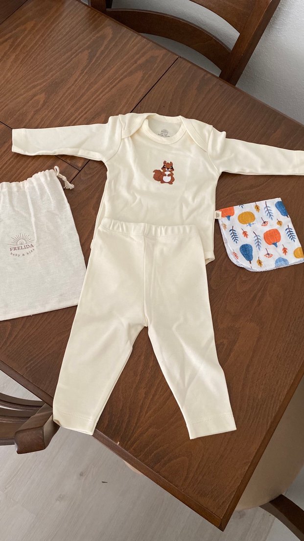 Bebeğim için hediye olarak geldi ancak ayına göre mevsime denk gelmediği için hiç kullanamadık. Unisex bir üründür. Kesesi ve hediye mendili ile birlikte gönderilecektir. Yumuşacık bir üründür, gönül rahatlığıyla tercih edebilirsiniz . Uzun kollu, beyaz pamuklu ve sincap baskılı üst ile uyumlu pantolon içeren bebek erkek takımı. Yuvarlak yaka ve yumuşak dokuludur. ️