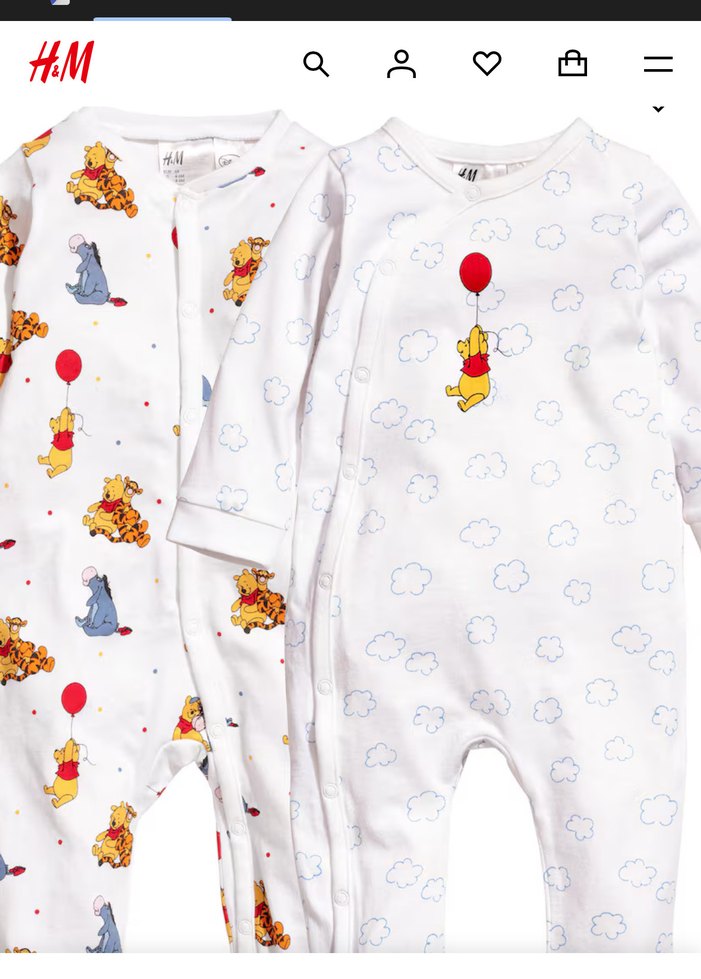 Renkli baskılı Winnie the Pooh desenlerine sahip iki beyaz pamuklu bebek tulumu. Bulut ve balon detayları içerir. H&M ürünü. Boy : 72 cm - göğüs 26 cm Etiketlerini kestiğimiz için 6-12 ay olduğunu düşünüyorum .
