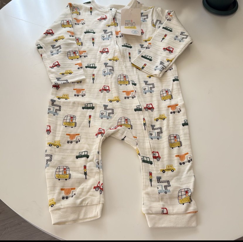 Uzun kollu, bisiklet yaka ve fermuarlı beyaz pamuklu erkek bebek tulumu. Renkli baskılı araba ve trafik işaretleriyle sokak stili.