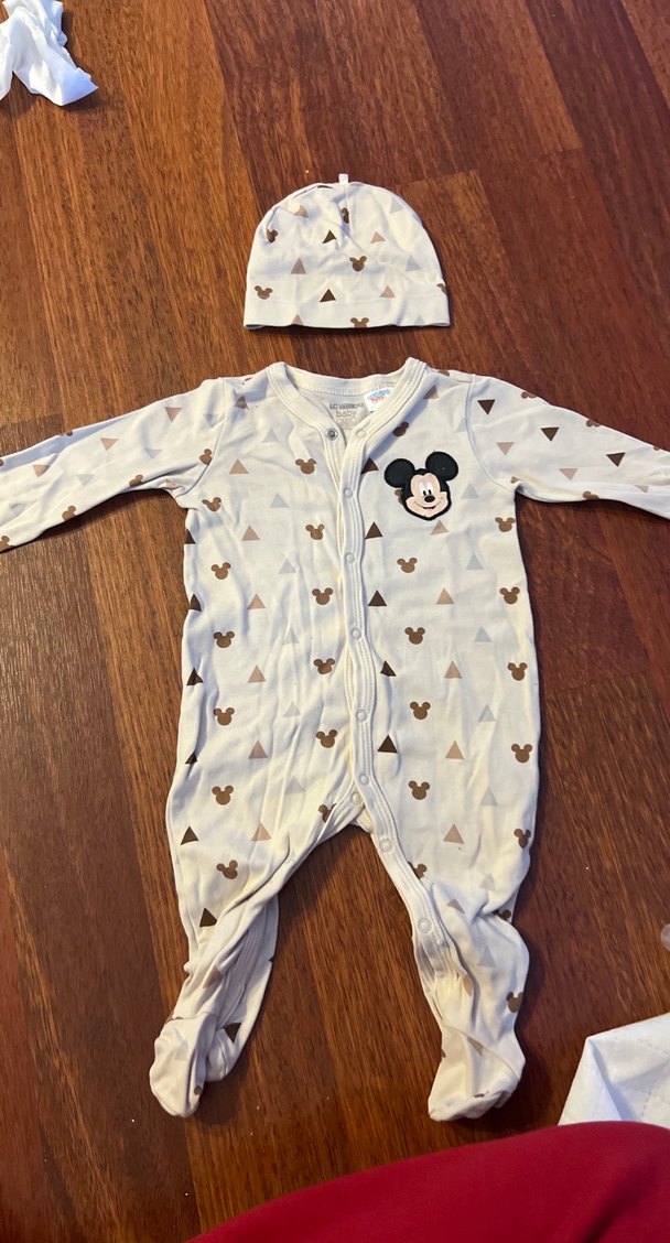 Uzun kollu, yuvarlak yaka beyaz pamuklu örme erkek bebek tulumu, baskılı desen ve Mickey Mouse aplikeli. Eşleşen şapka ile birlikte.