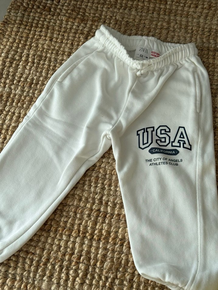 Beyaz pamuklu, bol kesim ve baskılı 'USA' yazılı, lastikli bel ve yan cepli kadın eşofmanı. Spor ve rahat kullanım için uygundur. ⚪