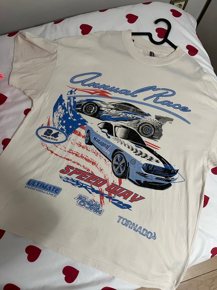 Pamuklu, kısa kollu, bol kesim erkek tişörtü. Beyaz renkte, baskılı yarış arabası ve 'TORNADO' yazısı bulunur. ️