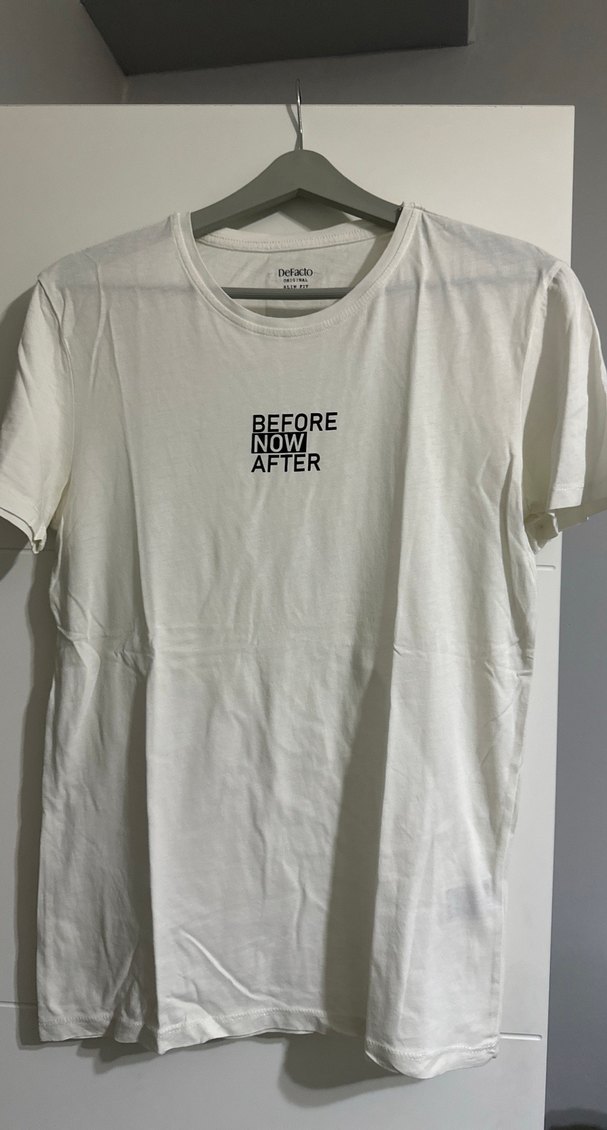 Beyaz pamuklu erkek tişört, yuvarlak yaka ve kısa kolludur. Minimalist sokak stili ve "BEFORE NOW AFTER" yazılı baskısı vardır.