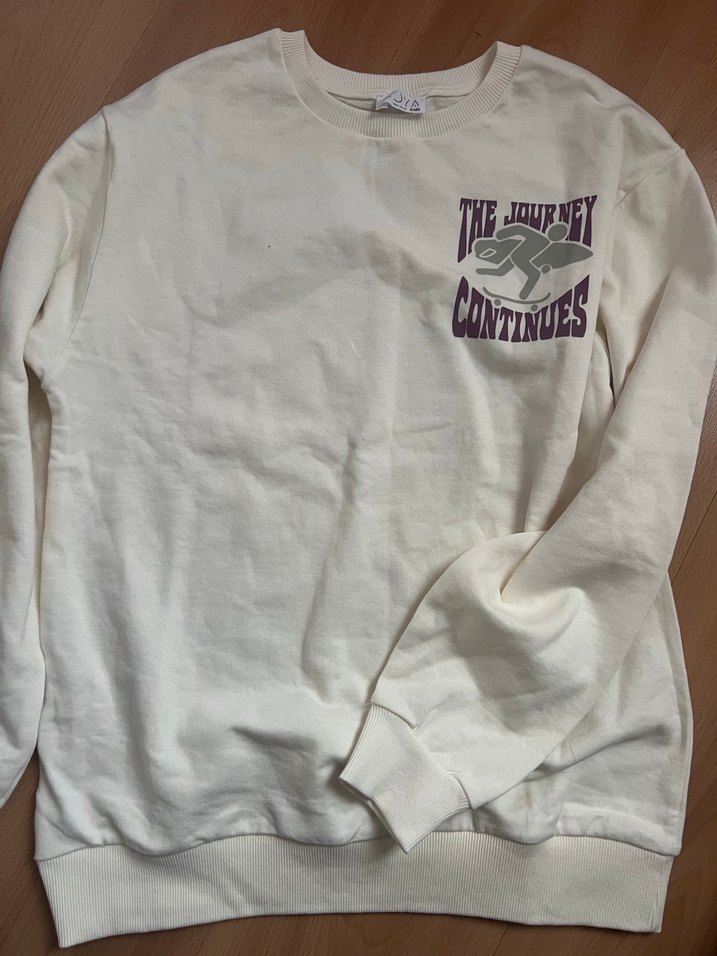 Beyaz pamuklu sweatshirt, uzun kollu ve bisiklet yaka. Baskılı "THE JOURNEY CONTINUES" yazısı bulunur. Rahat kesim, günlük kullanım için uygundur.
