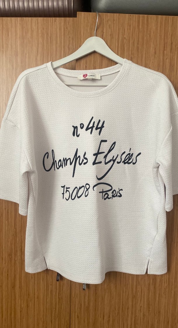Kadınlar için , yuvarlak yakalı ve kısa kolludur. Pamuklu örme kumaştan, beyaz renkte ve gri baskılı Champs Élysées yazılıdır. Sokak modasına uygun, rahat kesimdir.