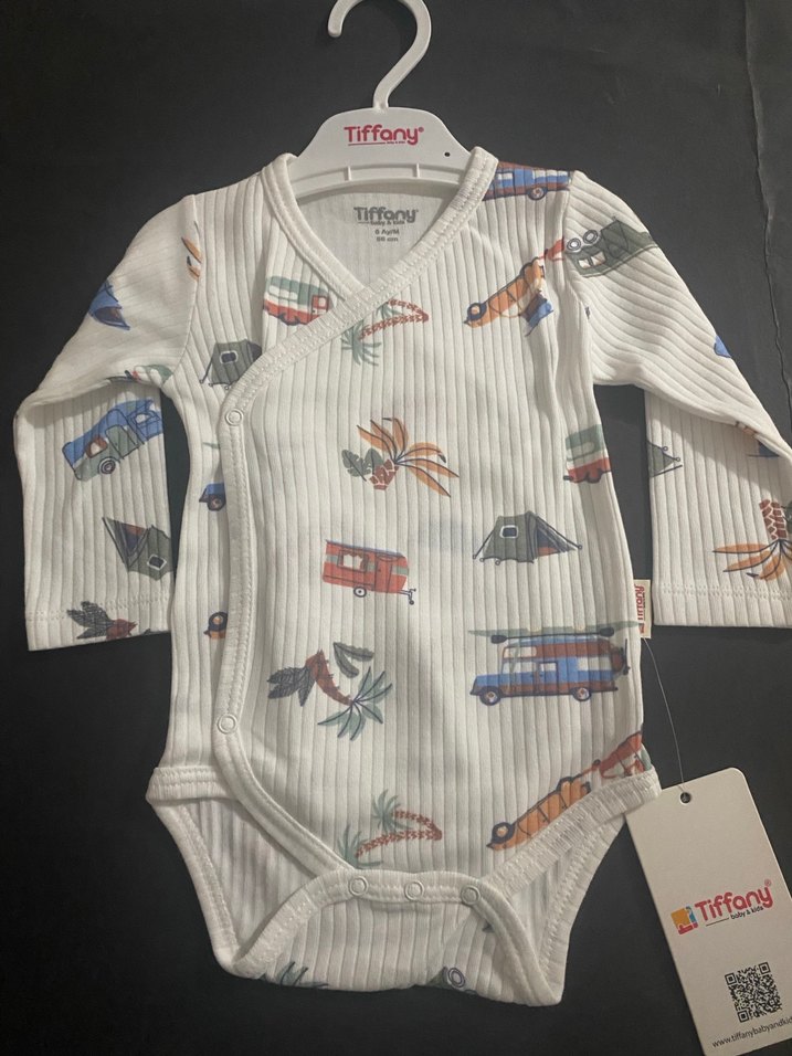 Beyaz renkte, pamuklu ve örme dokulu, V yakalı uzun kollu bebek body, renkli baskılarla süslenmiştir. Marka Tiffony'dir.