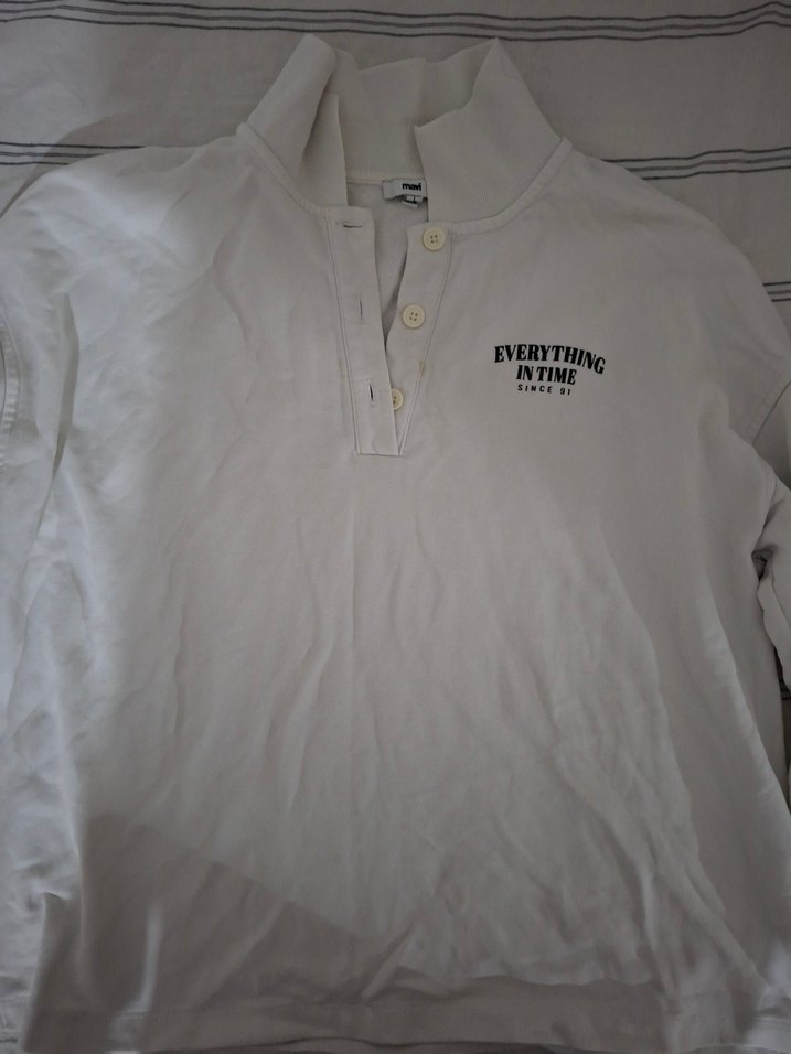 Pamuklu kumaştan yapılmış, uzun kollu ve yakalı, düğmeli beyaz baskılı bol kesim "EVERYTHING INTIME" yazılı baskısı ile sokak stiline uygun sweatshirt.Lekesi fotoğrafta gözüküyor.