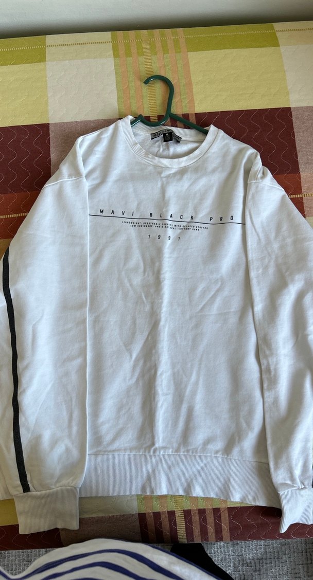 Uzun kollu, bisiklet yaka, baskılı beyaz pamuklu sweatshirt. Rahat kesimiyle günlük kullanıma uygun.
