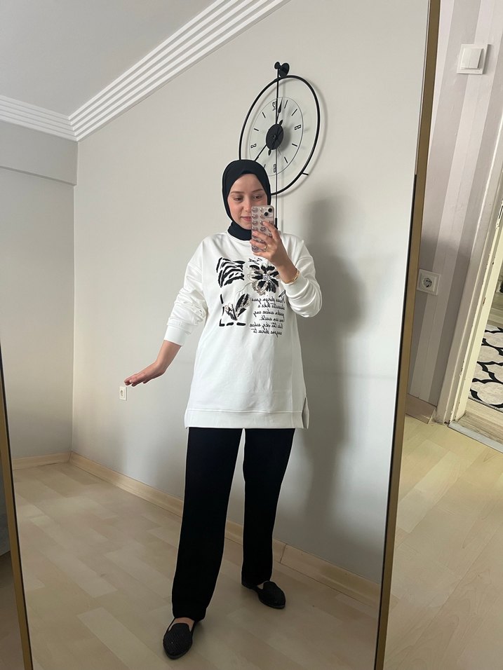 Beyaz pamuklu tunik, uzun kollu ve bisiklet yaka detaylıdır. Salaş kesimi ve baskılı deseniyle günlük rahat ve modest stil sunar. Bir oysho kumaş tır ikili takımdır