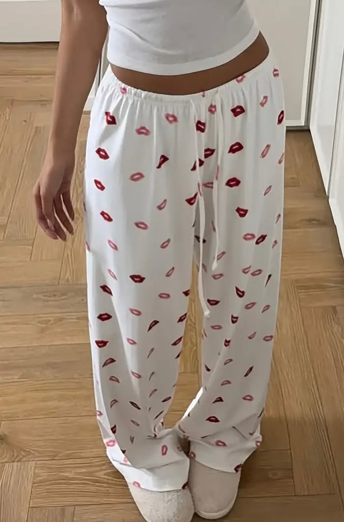 Baskılı kırmızı dudak desenli, rahat kesim beyaz pijama altı kullanılmadı