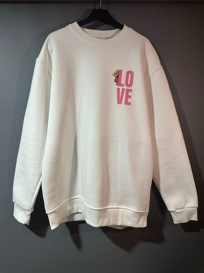 Beyaz renkte, yuvarlak yaka ve uzun kollu, bol kesim kadın sweatshirt. Pastel pembe "LOVE" baskısı ile yumuşak ve sıcak kumaştan üretilmiştir. HER BEDEN MEVCUT dilediğiniz baskı yapılırrrrr