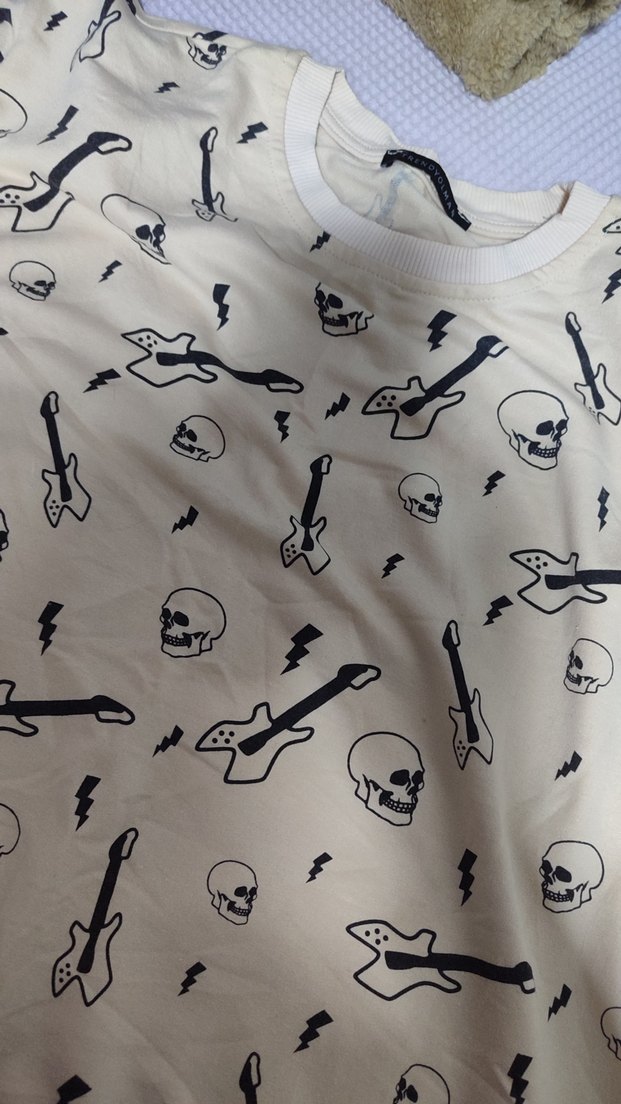 Pamuk kumaştan yapılmış, beyaz renkli, baskılı rock punk desenli, kısa kollu, bol kesim erkek tişörtü. kumaşı ince yapıda.