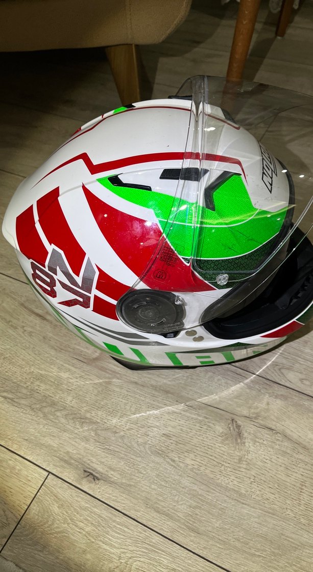 Beyaz seramik motosiklet kaskı, kırmızı ve yeşil baskılı desenlere sahiptir. Şeffaf vizör ve cırt cırtlı kayış ile güvenli kullanım sağlar, rock punk esintili sokak stilini yansıtır. Bir sezon kullanıldı, sıfırdan farksız, özel tasarım renk ve çizgiler, M bedendir. İçinde telefona bağlanabilen kulaklık ve mikrofon seti mevcuttur.