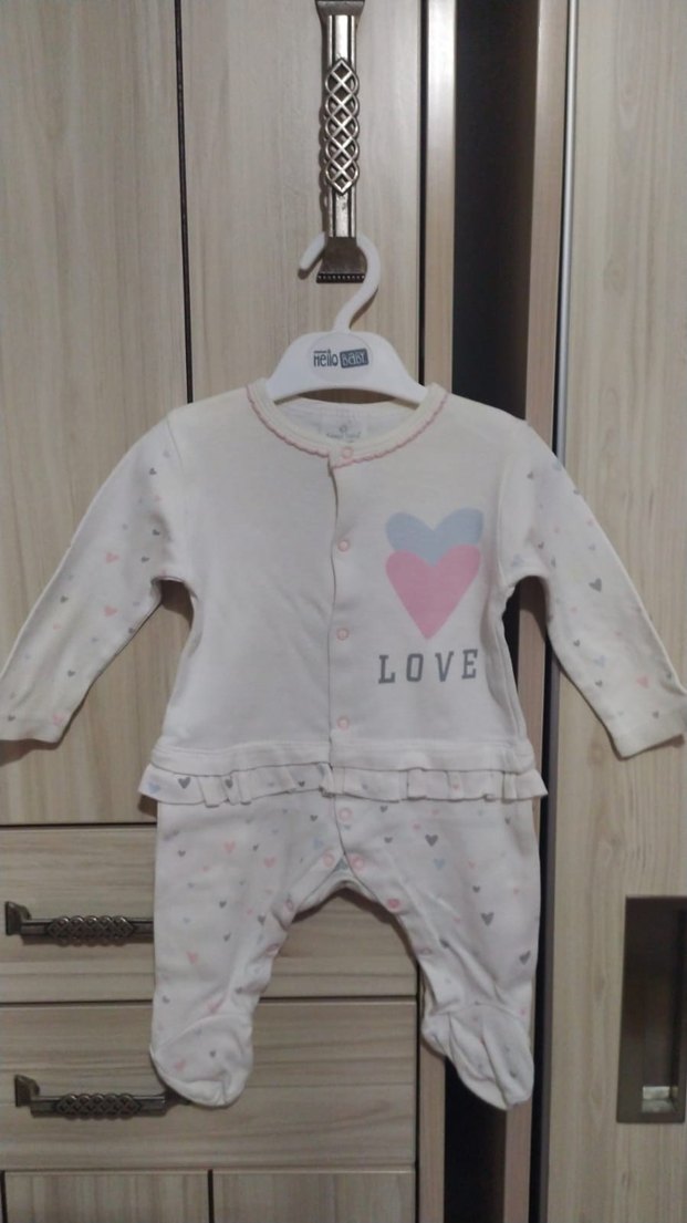 Pastel beyaz renkli, üzerinde kalp desenleri ve "LOVE" yazısı bulunan kız bebek tulumu. Önden düğmeli ve bel kısmında fırfır detaylı, yumuşak kumaştan.