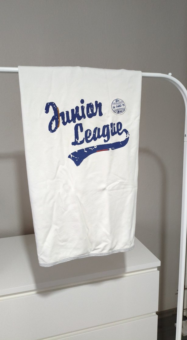 yaklaşık 80 cm x 80 cm beyaz renkte, renkli baskılı "Junior League" yazılı örtü . Üzerinde "Ceagie" yazısı bulunur.