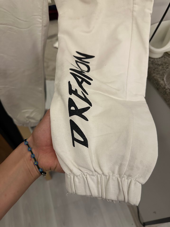 Bol kesim, fermuarlı manşetli beyaz baskılı erkek spor eşofman altı, yumuşak sentetik kumaştan, günlük kullanıma uygun.