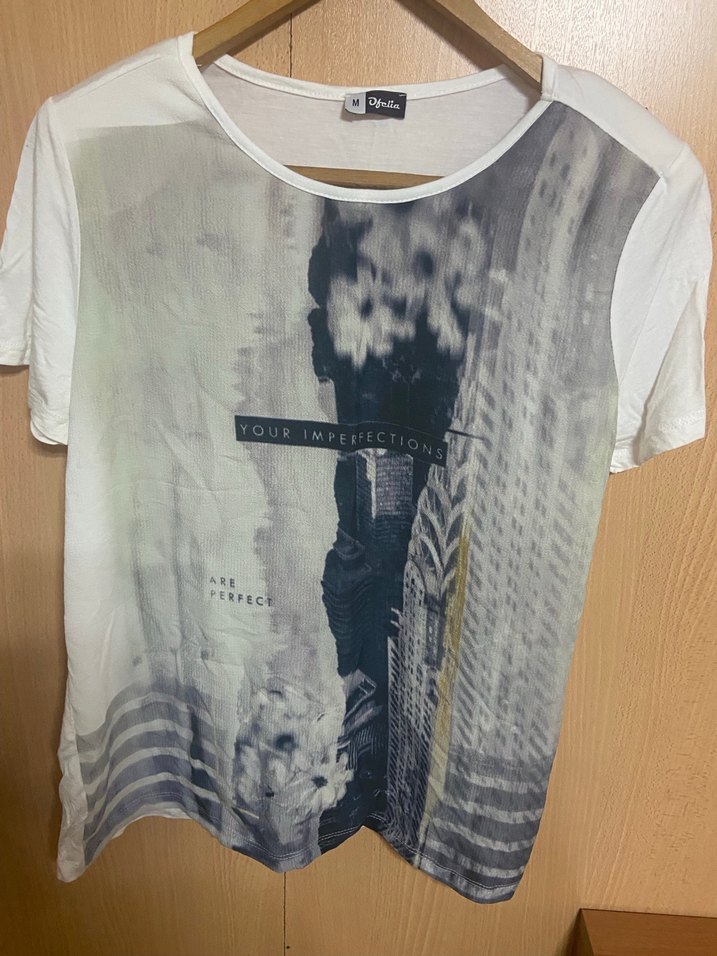 Beyaz, kısa kollu, pamuklu ve baskılı desenli salaş kesim kadın tişörtü. Yuvarlak yaka ve günlük kullanım için uygun.