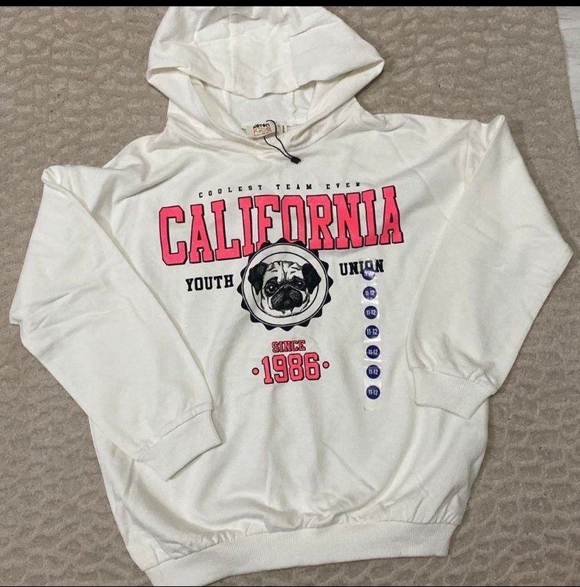 Uzun kollu, kapüşonlu ve bol kesim beyaz sweatshirt. Baskılı tasarım.
