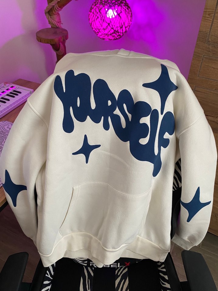 Beyaz renkli, bol kesim, uzun kollu ve bisiklet yaka sweatshirtü, baskılı desenlerle süslenmiş, yumuşak sentetik kumaştan üretilmiştir.
