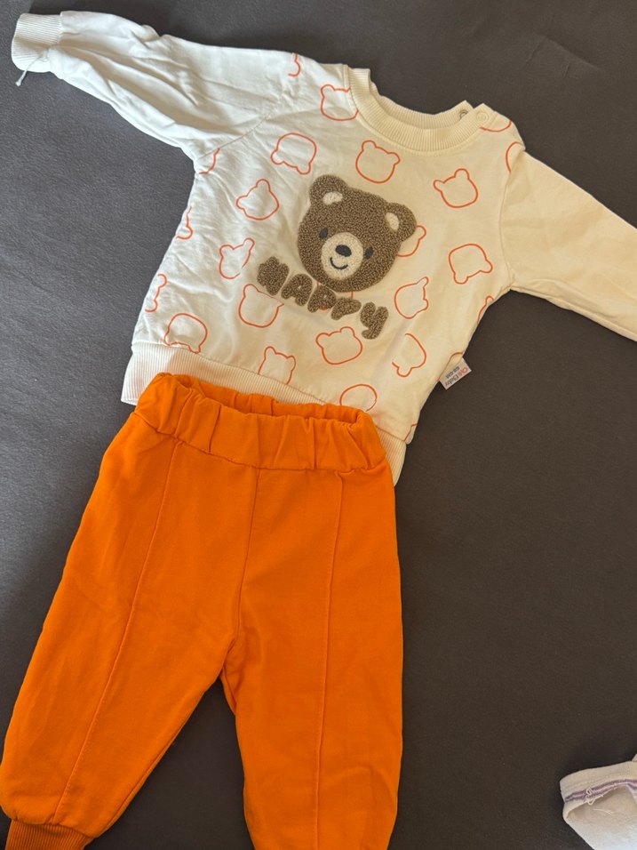 Beyaz, uzun kollu yuvarlak yaka sweatshirt üzerinde renkli ayı baskıları ve "Happy" yazısı bulunur. Rahat turuncu, elastik bel pantolon ile tamamlanır.