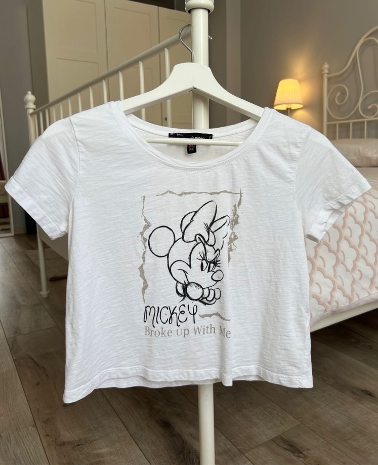 Pamuklu beyaz, kısa kollu, bol kesim tişörtü. Üzerinde baskılı çizgi karakter ve 'Broke up With Me' yazısı bulunur. Rock punk tarzına uygun.